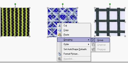 Se copie cele trei imagini inserate pe acelasi rand in situatia 2. Se modifica modul de dispunere a imaginii, alegandu-se modalitatea Square. Pozitia imaginilor se modifica. Se repozitioneaza imaginile folosind mouse-ul, precum si tastele sageata. Repozitionarea se poate face la acelasi nivel sau cu o dispunere diferita. Se selecteaza toate imaginile utilizand mouse-ul si tasta Shift. Se deschide meniul cascada si se alege optiunea pentru grupare, asa cum se arata in figura 6.