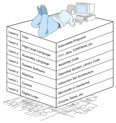 Programming experience teaches us that when a problem is large, we should break it down and use a "divide and conquer" approach. In programming, we divide a problem into modules and then design each module separately. Each module performs a specific task and modules need only know how to interface with other modules to make use of them. Computer system organization can be approached in a similar manner. Through the principle of abstraction, we can imagine the machine to be built from a hierarchy of levels, in which each level has a specific function and exists as a distinct hypothetical machine. We call the hypothetical computer at each level a virtual machine. Each level's virtual machine executes its own particular set of instructions, calling upon machines at lower levels to carry out the tasks when necessary. Figure 1 shows the commonly accepted layers representing the abstract virtual machines.