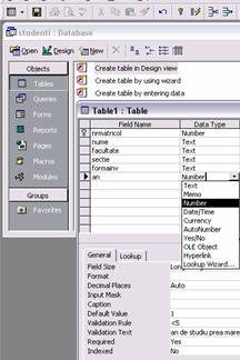 Daca se solicita crearea unui tabel, in fereastra care se deschide se vor specifica numele, tipul si proprietatile campurilor care alcatuiesc tabelul.