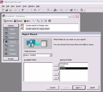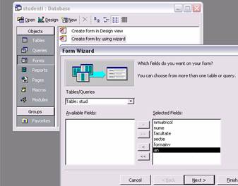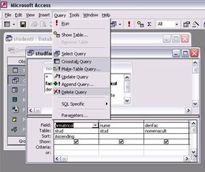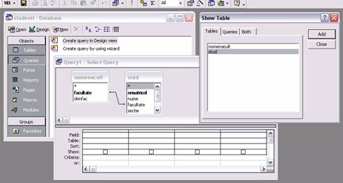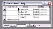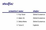 Pentru a putea folosi pe langa datele din tabelul stud.dbf si denumirea facultatii din tabelul nomenfacult.dbf , se realizeaza o interogare din cele doua tabele: