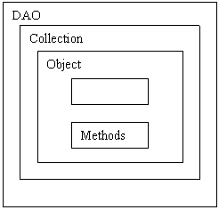 DAO este implementat sub forma unei ierarhii de colectii si obiecte. Toate tabelele, campurile, indecsii, query-urile etc. sunt reprezentate ca obiecte organizate in colectii. Fiecare obiect are un set de proprietati care ii definesc caracteristicile si una sau mai multe metode pe care le putem folosi pentru a executa diferite operatii cu obiectele. In continuare, dorim sa prezentam fiecare colectie in parte, precum si obiectele pe care le contin.