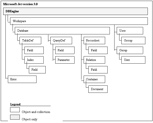 In ierarhia DAO, toate obiectele sunt derivate dintr-un singur obiect care reprezint` motorul pentru baze de date din Microsoft Jet. Figura prezint` fiecare colecie care este derivat` din obiectul DBEngine.