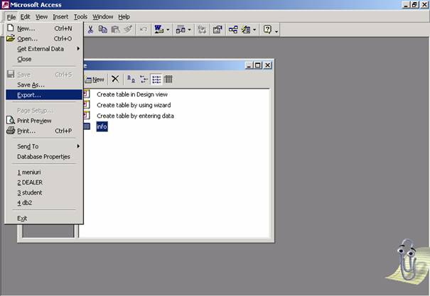 Pentru a efectua un export de date dintr-o tabela vom folosi comanda File, Export: si se va alege apoi tipul de fisier catre care se efectueaza exportul de date din tabela (.rtf, .xls, .htm).
