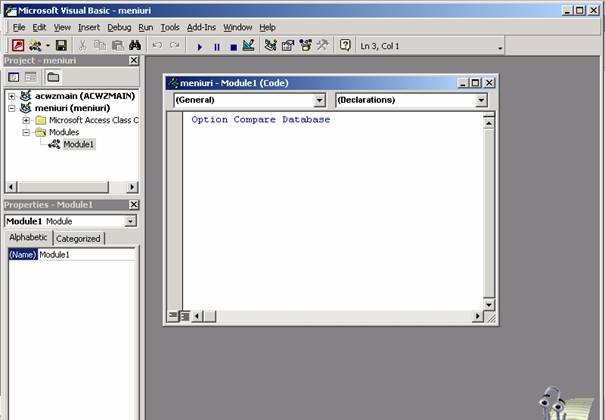 Editarea modulelor in Access: Limbajul Visual Basic constituie instrumentul de programare pentru aplicatiile informatice dezvoltate cu ajutorul pachetului Office 2000. Modulele din Access sunt obiecte ale bazei de date, care permit scrierea de rutine in Visual