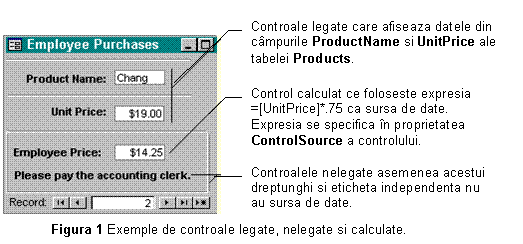 Controalele pot fi legate, nelegate sau calculate. Controlul legat este asociat unui camp al tabelei sau interogarii de baza. Controalele legate sunt folosite pentru a afisa, edita si actualiza valorile campurilor din baza de date. Controlul calculat foloseste o expresie ca sursa de date. Expresia poate utiliza datele dintr-un camp al tabelei sau interogarii de baza al formularului sau raportului. Controlul nelegat nu are sursa de date. Puteti folosi controalele nelegate pentru a afisa informatii, linii, dreptunghiuri si ilustratii. In figura 1 sunt prezentate exemple de controale legate, nelegate si calculate.