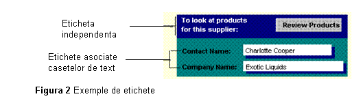 Etichetele sunt folosite pe un formular sau raport pentru a afisa text descriptiv cum ar fi: titlurile, semnificatiile sau scurte instructiuni (vezi figura 2). Etichetele nu afiseaza valorile din campuri sau expresii; ele sunt intotdeauna nelegate si ele nu se schimba in timp ce va deplasati de pe un articol pe altul.