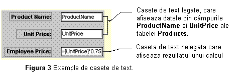 Pe un formular sau un raport casetele de text se folosesc pentru a afisa datele dintr-o tabela, interogare sau instructiune SQL (vezi figura 3). Acest tip de caseta de text poarta numele de caseta de text legata deoarece ea este legata la datele dintr-un camp. Casetele de text pot fi si nelegate. Spre exemplu, puteti crea o caseta de text nelegata pentru a afisa rezultatul unui calcul sau pentru a accepta introducerea facuta de utilizator. Datele dintr-o caseta de text nelegata nu sunt memorate nicaieri.