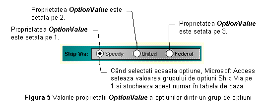 Daca un grup de optiuni ese legat la un camp, atunci numai cadrul grupului este legat la camp, nu si casetele de validare, butoanele de comutare sau butoanele de optiune din interiorul cadrului. In locul setarii proprietatii ControlSource pentru fiecare control din grupul de optiuni, dvs. setati proprietatea OptionValue a fiecarei casete de validare, buton de comutare sau buton de optiune pe numarul care are semnificatie pentru campul de care este legat cadrul grupului. Atunci cand selectati o optiune dintr-un grup de optiuni, Microsoft Access seteaza valoarea campului la care grupul de optiuni este legat la valoarea proprietatii OptionValue a optiunii selectate (vezi figura 5).