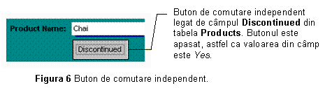 Puteti folosi un buton de comutare pe un formular ca un control independent pentru a afisa o valoare Yes/No dintr-o tabela, interogare sau instructiune SQL de baza. Spre exemplu, butonul de comutare din exemplu prezentat in figura 6 este legat de campul Discontinued din tabela Products. Tipul datei campului Discontinued este Yes/No. Atunci cand butonul nu este apasat, valoarea din tabela Products este No.