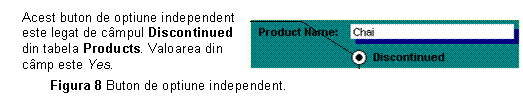 Puteti folosi un buton de optiune pe un formular sau raport drept control independent pentru a afisa o valoare Yes/No dintr-o tabela, interogare sau instructiune SQL de baza. Spre exemplu, butonul de optiune din exemplul prezentat in figura 8 este legat de campul Discontinued din tabela Products. Tipul de data a campului Discontinued este Yes/No. Daca butonul de optiune este selectat, atunci valoarea este Yes; daca nu, valoarea este No.