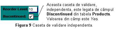 Puteti folosi o caseta de validare pe un formular sau raport drept control independent pentru a afisa o valoare Yes/No dintr-o tabela, interogare sau instructiune SQL de baza. Spre exemplu, caseta de validare din exemplul prezentat in figura 9 este legata de campul Discontinued din tabela Products. Tipul de data a campului Discontinued este Yes/No. Daca caseta de validare contine simbolul de verificare, atunci valoarea este Yes; daca nu, valoarea este No.