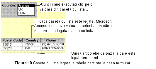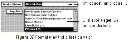Atunci cand utilizatorul selecteaza o valoare dintr-o caseta cu lista sau caseta combinata, aveti doua posibilitati: puteti stoca valoarea selectata intr-o tabela (nu aceeasi cu cea din care ati obtinut lista) sau puteti transmite valoarea unui alt control. Spre exemplu, pentru caseta cu lista Supplier din figura 37, daca un utilizator selecteaza "Pavlova, Ltd.", atunci Microsoft Access cauta valoarea cheii primare (SupplierID) pentru Pavlova, Ltd. din tabela Suppliers si seteaza campul SupplierID (cheie externa) din tabela Products la aceeasi valoare. Aceasta este valoarea care se stocheaza. Deoarece memorati o valoare pe baza unei selectii din caseta cu lista, aceasta este legata (Retineti ca valoarea SuuplierName care provine din tabela Suppliers este afisata in lista dar nu este stocata).