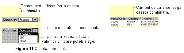 In cele majoritatea cazurilor este mai rapid si mai usor sa selectati o valoare dintr-o lista decat sa memorati valoare de tastat. Puteti realiza acest lucru fara a ocupa prea mult spatiu pe un formular folosind o caseta combinata. Caseta combinata reprezinta o combinare dintre o caseta de text si o caseta cu lista.