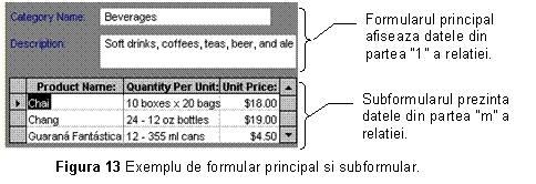 Subformularele sunt rficiente in special atunci cand vreti sa prezentati datele din tabele sau interogari cu relatii 1 m (one-to-many). Spre exemplu, puteti crea un formular cu un subformular pentru a prezenta datele din tabelele Categories si Products. Datele din tabela Categories rerezinta partea "1" din relatie, iar datele din tabela Products reprezinta partea "m" din relatie - fiecare categorie poate avea mai mult de un singur produs (vezi figura 13).