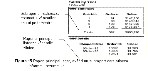 Legati raportul principal la o tabela, interogare sau instructiune SQL de baza atunci cand doriti sa inserati subrapoarte ce contin informatii care sunt corelate cu datele din raportul principal. Spre exemplu, puteti folosi raportul principal pentru a afisa articolele detaliu, cum ar fi fircare vanzare dintr-un an, si apoi folositi un subraport pentru a prezenta infiramtiile rezumative, cum ar fi totalul vanzarilor din fiecare trimestru (vezi figura 15).
