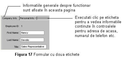 Puteti folosi un control Tab pentru a prezenta cateva pagini de informatii ca un singur set. Aceasta este utilza in special atunci cand cu multe controale ce pot fi sortate in doua sau mai multe categorii. Spre exemplu, probabil ca veti dori sa folositi un control Tab pe formularuil Employees pentru a separa informatiile generale de cele personale (vezi figura 17).