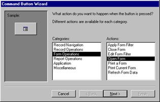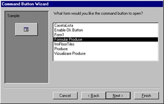 II. In a doua caseta de dialog Command Bbutton Wizard se va selecta formularul ce va fi deschis de catre butonul de comanda si apoi se va executa clic pe Next pentru a continua procesul de creare.