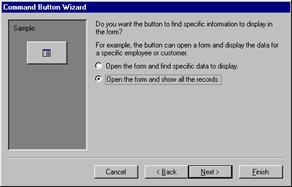 III. In a treia caseta de dialog Command Button Wizard (vezi figura 21) se va selecta optiunea Open the form and find specific data to display daca vreti ca prin intermediul butonului de comanda sa deschideti formularul specificat si sa fie cautate anumite date pentru a fi afisate sau se va selecta optiunea Open the form and show all the records daca vreti ca formularul ce se va deschide de catre butonul de comanda sa prezinte toate articolele. Pentru a continua operatia de creare executati clic pe butonul Next.