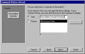 IV. In a patra caseta de dialog Command Button Wizard (vezi figura 22) se va selecta optiunea Text daca vrem ca in butonul de comanda sa apara un text (cel ce se va introduce in caseta de text din dreapta optiunii) sau optiunea Picture daca in butonul de comanda vrem sa apara o imagine. Pentru continuarea operatiei de creare a butonului de comanda se executa clic pe Next.
