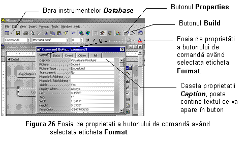 Daca doriti sa afisati text in butonul de comanda, selectati eticheta Format a foii de proprietati si in caseta proprietatii Caption tastati textul dorit (vezi figura 26). Daca nu doriti un text pe butonul de comanda, atunci puteti folosi o imagine.