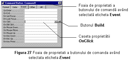 Se selecteaza eticheta Event (vezi figura 27) a foii de proprietati si in caseta proprietatii OnClick introduceti numele macro-ului sau procedurii eveniment care vreti sa fie executata atunci cand se executa clic pe buton sau executati clic pe butonul Build din bara instrumentelor Database (vezi figura 25) sau din caseta proprietatii (vezi figura 27) pentru a folosi Macro Builder sau Code Builder.