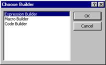 Daca ati executat clic pe butonul Build, atunci pe ecran se deschide o caseta de dialog pentru a putea selecta un Macro Builder sau Code Builder (vezi figura 28).