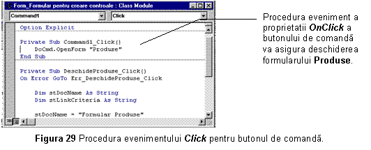Daca in caseta de dialog Choose Builder se alege Code Builder si apoi se executa clic pe OK, atunci se deschide fereastra de editare cod Visual Basic, in care se va tasta codul procedurii eveniment pentru proprietatea OnClick (vezi figura 29).