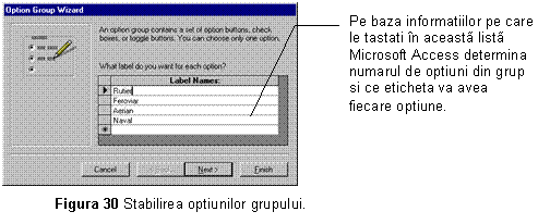 In prima caseta de dialog Option Group Wizard se va stabili care sunt optiunile grupului. In lista casetei cu dialog se tasteaza eticheta fiecarei optiuni din grup (vezi figura 30). Pe baza acestor date Microsoft Access determina si numarul de optiuni din grup. Executati clic pe Next pentru a continua..