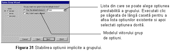 In a doua caseta de dialog Option Group Wizard se va stabili daca va exista sau nu o optiune prestabilita, selectand fir butonul de optiune Yes, the default choice is; sau No, Idon't want a default (vezi figura 31). Daca ati selectat optiunea Yes, the default choice is:, atunci din lista aflata langa acest buton puteti alege optiunea prestabilita (cea care va fi selectata la deschiderea formularului). Executati clic pe Next pentru a continua.