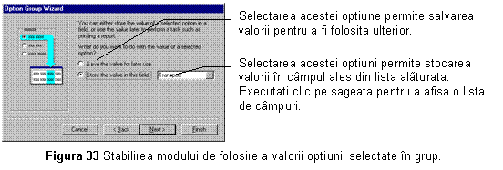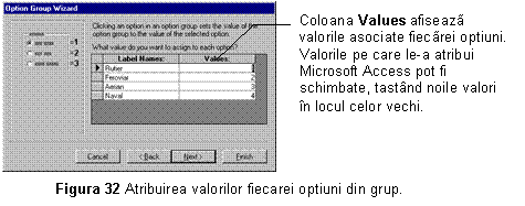 In a treia caseta Option Group Wizard se stabilesc valorile ce se vor atribui fiecarei optiuni. Microsoft Access va propune un set de valori (vezi figura 32), dar puteti sa le schimbati tastand noile valori in coloana Values. Executati clic pe Next pentru a continua.