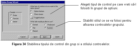 In a cincea caseta Option Group Wizard se stabileste tipul de control ce se va folosi in grupul de optiuni si stilul acestui control (vezi figura 34). Executati clic pe Next pentru a continua.
