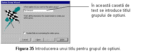 In ultima caseta Option Group Wizard se stabileste titlul grupului de optiuni (vezi figura 35). Executati clic pe Finish pentru a termina crearea grupului de optiuni.