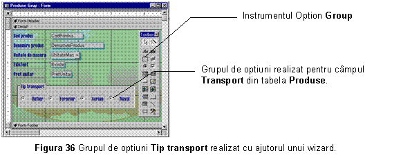 Dupa ce ati executat clic pe butonul Finish in ultima caseata de dialog Option Group Wizard, Microsoft Access 97 creaza grupul de optiuni (vezi figura 36) pe baza informatiilor furnizate.