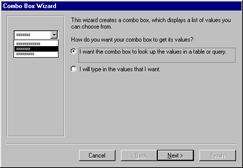 Deoarece se creaza o caseta combinata care sa afiseze valorile dintr-un camp al unei tabele, in prima caseta de dialog Combo Box Wizard se va selecta optiunea "I want the combo box to look up the values in a table or query" (vezi figura 38). Executati clic pe butonul Next pentru a continua.