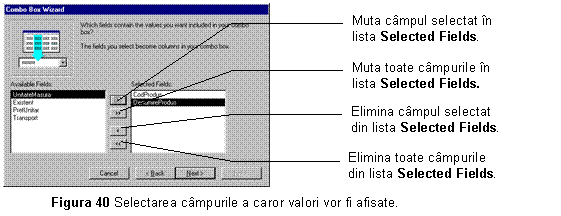 In a treia caseta de dialog Combo Box Wizard se aleg campurile care contin valorile ce vor fi afisate. In lista Available Fields se selecteaza un camp si se excuta clic pe butonul > pentru a-l muta in lista Selected Fields (vezi figura 40). Executati clic pe butonul Next pentru a continua.