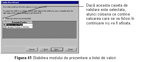 In a patra caseta de dialog Combo Box Wizard se stabileste cum va arata lista si daca se afiseaza sau nu coloana care contine valoarea ce va fi folosita ulterior (vezi figura 41). In pasul anterior am selectat doua campuri, dar in aceasta caseta de dialog am stabilit ca se vor afisa numai valorile campului DenumireProdus. Totusi, daca in continuare se va folosi optiunea selectata de utilizator in lista pentru a executa alte operatii, atunci valoarea ce se va utiliza corespunde valorii din CodProdus (coloana din lista care nu este afisata). Lista din control poate afisa mai multe coloane, nu doar o singura coloana ca in acest exemplu. Executati clic pe butonul Next pentru a continua.