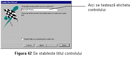 In a cincea caseta de dialog Combo Box Wizard se tasteaza numele controlului (vezi figura 42). Acestea sunt toate informatiile pe care trebuie sa le furnizati wizard-ului pentru a crea caseta cu lista sau caseta combinata.