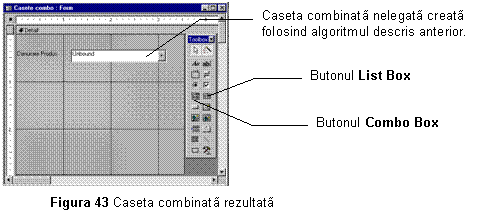 Operatia de creare a casetelor cu lista sau a casetelor combinate, legate, folosind List Box Wizard respectiv Combo Box Wizard este foarte asemanatoare cu crearea campurilor folosind Lookup Wizard, care a fost tratat pe larg intr-un alt capitol, in continuare se va prezenta numai crearea celor doua tipuri de controale nelegate, folosind un wizard.