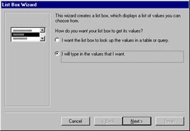 Deoarece vrem sa realiza un control care va afisa o lista fixa de valori, in prima caseta de dialog List Box Wizard se selecteaza optiunea "I will type in the values that I want" (vezi figura 44). Executati clic pe butonul Next pentru a continua.