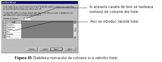 In a doua caseta de dialog List Box Wizard se stabileste cate coloane va avea lista si care sunt optiunile listei (vezi figura 45). Executati clic pe butonul Next pentru a continua.
