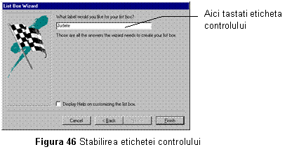 In ultima caseta de dialog List Box Wizard se precizeaza eticheta controlului. Pentru a termina operatia de creare a controlului executati clic pe butonul Finish.