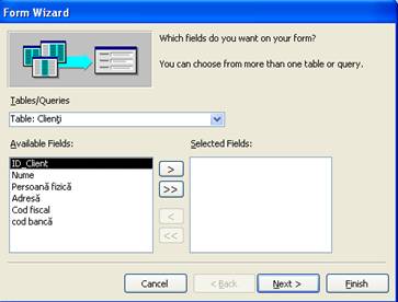 b) preluarea campurilor pe rand din zona Available Field in zona Selected Field cu ajutorul butonului sageata simpla sau a tuturor campurilor prin butonul sageata dubla .