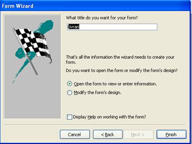 Cadrul formulelor se creaza simplu folosind programul ajutator wizard prin selectarea optiunii a doua Create form by using wizard.