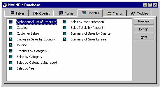 Daca se executa click pe butonul Design (Proiectare) obiectul selectat va fi deschis in modul de afisare Design in vederea modificarilor. Daca se executa click pe butonul New (Nou) va fi creat un obiect nou de tipul respectiv.