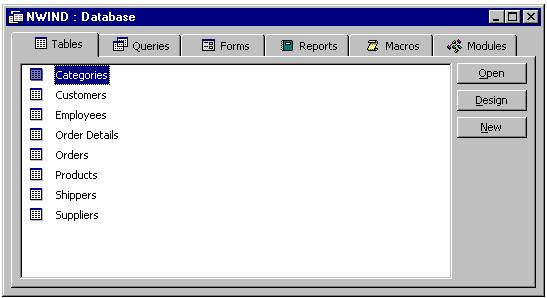 Access raspunde prezentand o fereastra Database ce contine componentele bazei de date deschise.