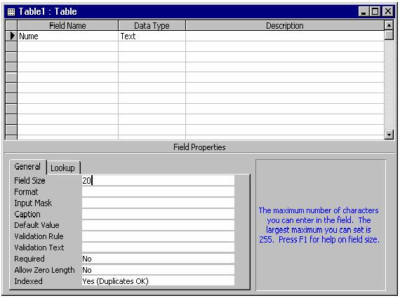 In partea de jos a ferestrei Table Design (Proiectare tabel) se pot preciza proprietatile unui camp: