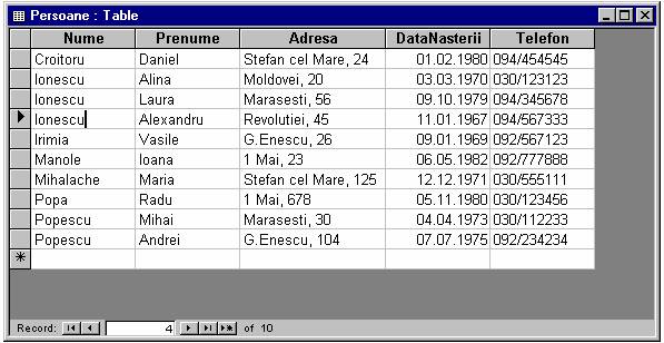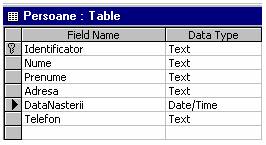 Fiecare camp stocheaza date de un anumit tip. De exemplu, in campul Nume sunt date de tip Text, in campul DataNasterii sunt date de tip data calendaristica. O linie din tabel reprezinta o inregistrare.