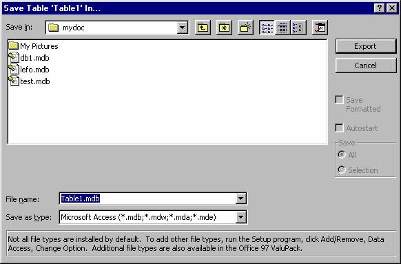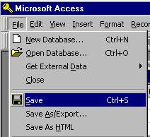 Pentru a salva un fisier Access, se apeleaza functia Save din meniul File, sau se apasa pictograma existenta in bara de sub meniul File