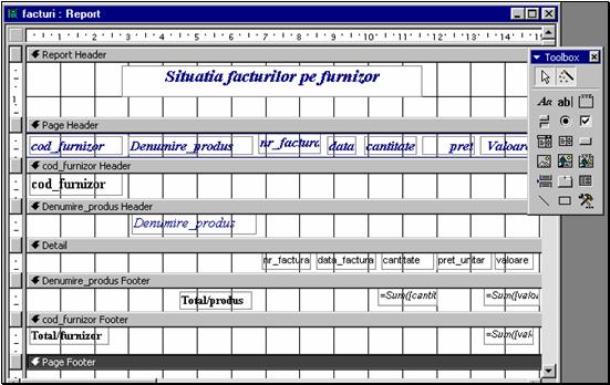 Pentru modificarea raportului astfel obtinut in sensul adaugarii/stergerii de campuri, de grupari si subtotaluri se deschide raportul in modul Design View si se foloseste caseta de instrumente ToolBox (fig. 15)