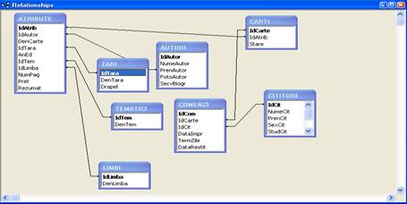 Daca la proiectarea tabelelor tinem cont de principiile expuse mai sus , atunci Access stabileste automat relatiile dintre tabelele care contin campuri comune. Totusi putem stabili relatii intre tabelele bazei de date si in mod explicit, utilizind comanda Relationships din meniul Tools. In acest caz apare o fereastra in care indicam tablele care stabilesc relatiile, apoi, cu ajutorul mouse-ului, trasam legaturile intre campurile respective.